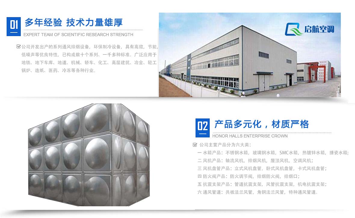 德州啟航空調(diào)設備有限公司始建于1998年,地處風光秀麗的魯西北平原,京杭大運河畔,是集設計、生產(chǎn)、開發(fā)于一體的專業(yè)化生產(chǎn)公司。公司投資引進國內(nèi)先進的雙動拉伸液壓機、剪板,沖床鋁合金成套設備,配合高精密的數(shù)控拉伸成型、模壓成型組合不銹鋼焊接式、法蘭連接式水箱、搪瓷水箱并且擁有模壓風機成套設備。另外還生產(chǎn)各種規(guī)格的軸流、斜流分機及各種規(guī)格的SMG水箱,各種防火閥、鋁合金風口、散流器等。